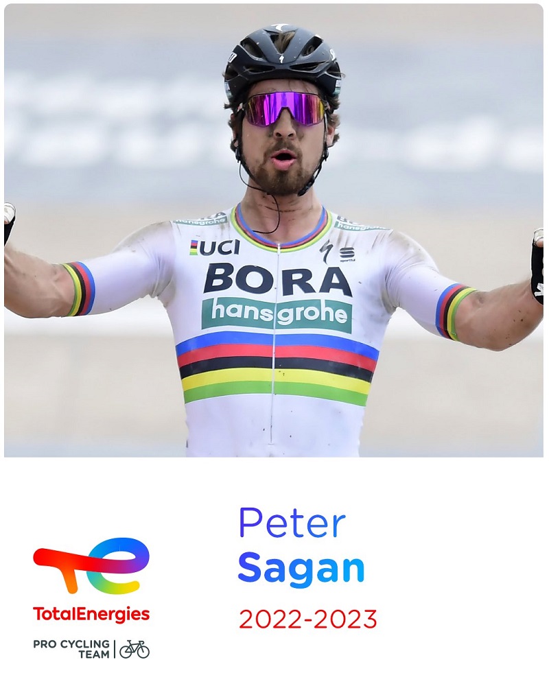 El ciclista eslovaco Peter Sagan, triple campeón del mundo, fichó por el equipo francés TotalEnergies por las próximas dos temporadas (2022 y 2023), anunció el mismo team en redes sociales, donde lo presentaron con “gran orgullo” y también informaron que la marca Specialized suministrará sus bicicletas, cascos, zapatillas y más a todo el equipo.