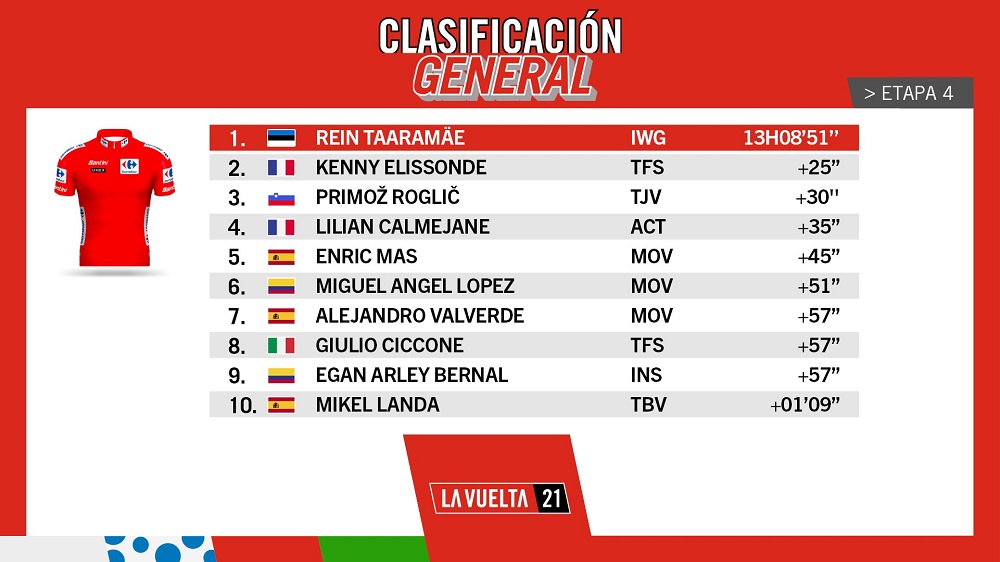 Por su parte, pese a sufrir una caída en la etapa, el estonio Rein Taaramäe (Intermarche-Wanty-Gobert Materiaux) defendió la camiseta roja de líder con una ventaja de +25 segundos sobre el francés Kenny Elissonde (Trek-Segrafedo), aunque considera que puede pelearla al menos durante dos etapas más.