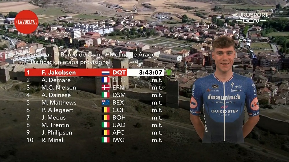 El neerlandés Fabio Jakobsen (Deceunninck-Quick Step) se proclamó ganador de la 4ª etapa de La Vuelta a España, disputada entre El Burgo de Osma y Molina de Aragón con 163,9 km en plano, repitiendo la lograda hace 2 años.