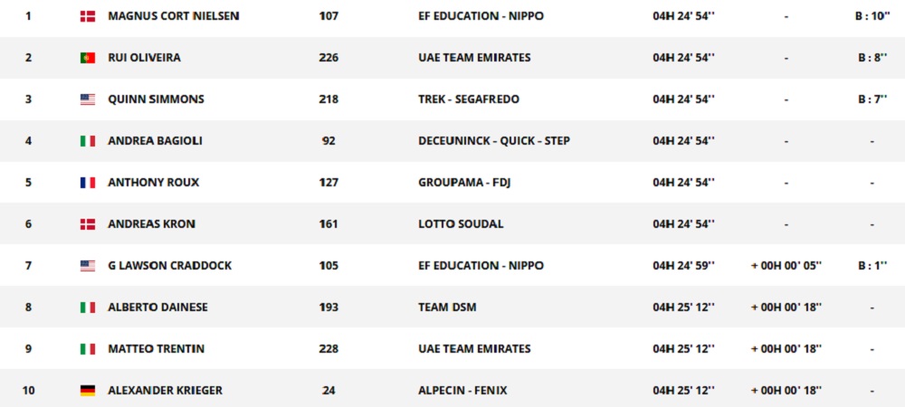En una etapa de media montaña de 191,2 km con 3 puertos de montaña al inicio pero que terminaba en plano, el danés Cort Nielsen brilló en el sprint final entre los 7 que aguantaron la fuga del día.