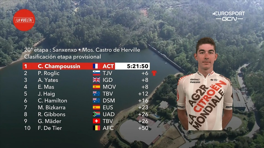 El francés Clément Champoussin (AG2R-Citroen Team) ganó una movida etapa 20 de La Vuelta a España 2021, donde consiguió el triunfo en un remate en los metros finales para ganarle al pelotón de los 4 favoritos que venía en punta (Roglic, Haig, Mas y Yates) y con una polémica en torno al colombiano Miguel Ángel López, que abandonó la carrera.