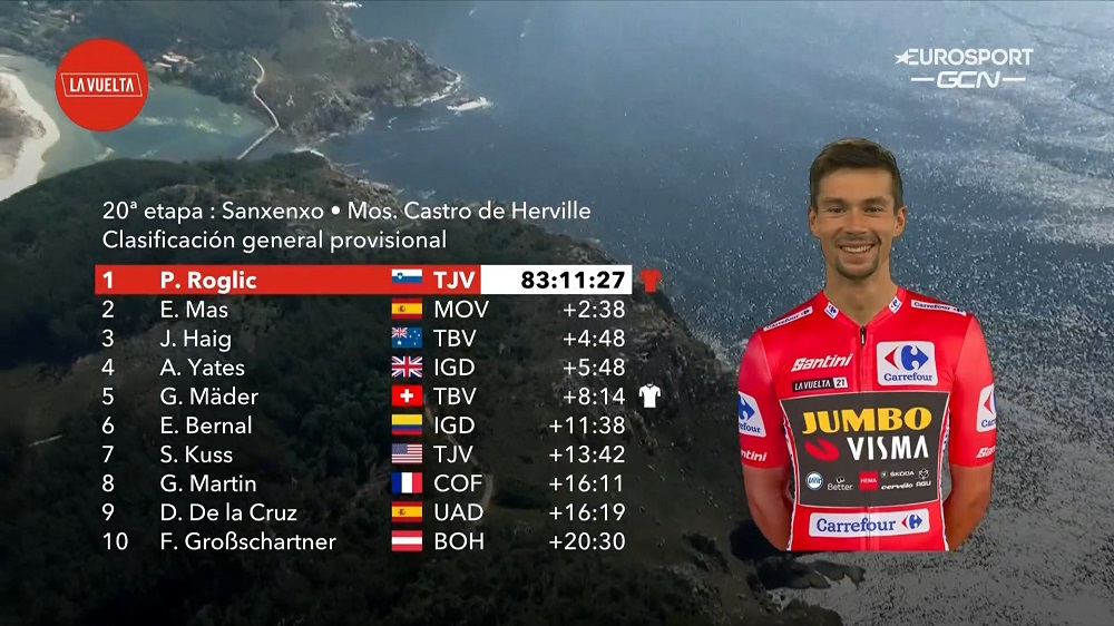 - Maillot rojo (líder): PrimozRoglic (Jumbo-Visma) 83:11:27