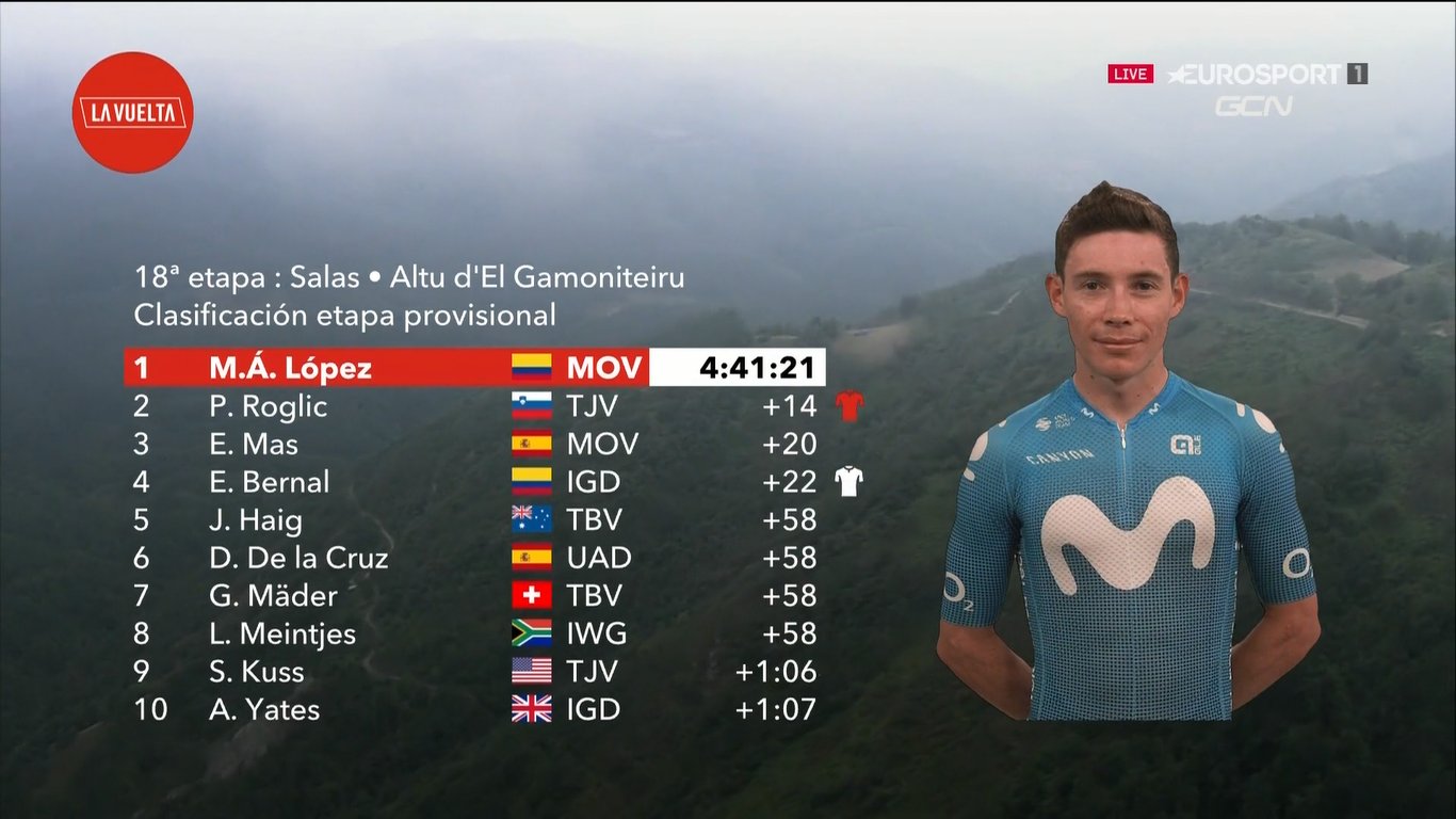 El colombiano Miguel Ángel López le dio la primera victoria del año en una de las grandes al Movistar Team, tras imponerse en la 18ª Etapa de La Vuelta, la reina de la competición con un durísimo ascenso al Altu d’El Gamoniteiru con 14,6 km a 9,8% de desnivel. ¡Tremendo!