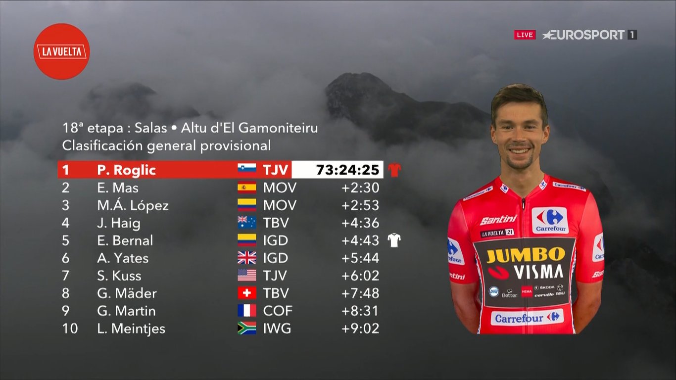 - Maillot rojo (líder): Primoz Roglic (Jumbo-Visma) 73:24:25