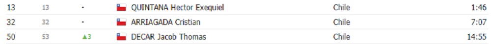 Entre los nacionales, Quintana destacó como el segundo mejor ciclista joven del evento con un tiempo de 15:05:57, mientras que Arriagada (6º) y Decar (7º) también se ubicaron el top10 joven.