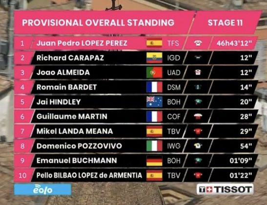 A pesar de que Juan Pedro López no estuvo en el podio, sigue liderando con solvencia la clasificación general de Maglia Rossa tras realizar la etapa sin mayores dificultades, pero el ecuatoriano Richard Carapaz (Ineos Grenadiers), además de ser el mejor latinoamericano de la competencia, se ubica segundo acechando al primer puesto de la clasificación general, que quedó así: