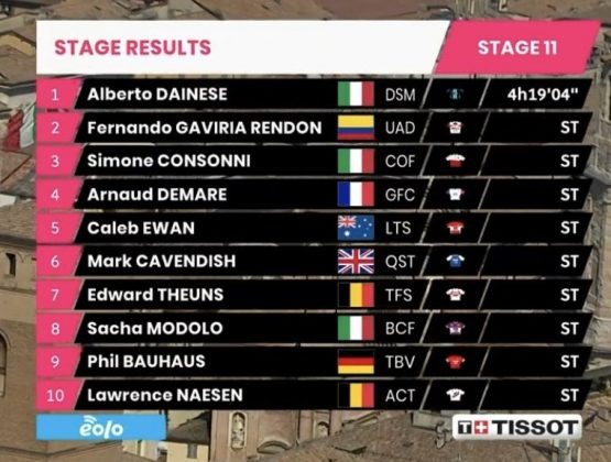 El italiano Alberto Dainese (team DSM) ganó la 11ª etapa del Giro de Italia, etapa llana de 203 km que comenzó en Santarcangelo di Romagna y terminó Reggio Emilia, tras batir a Gaviria en el esprint. De este modo, se transformó en el primer triunfo de un italiano en esta edición.