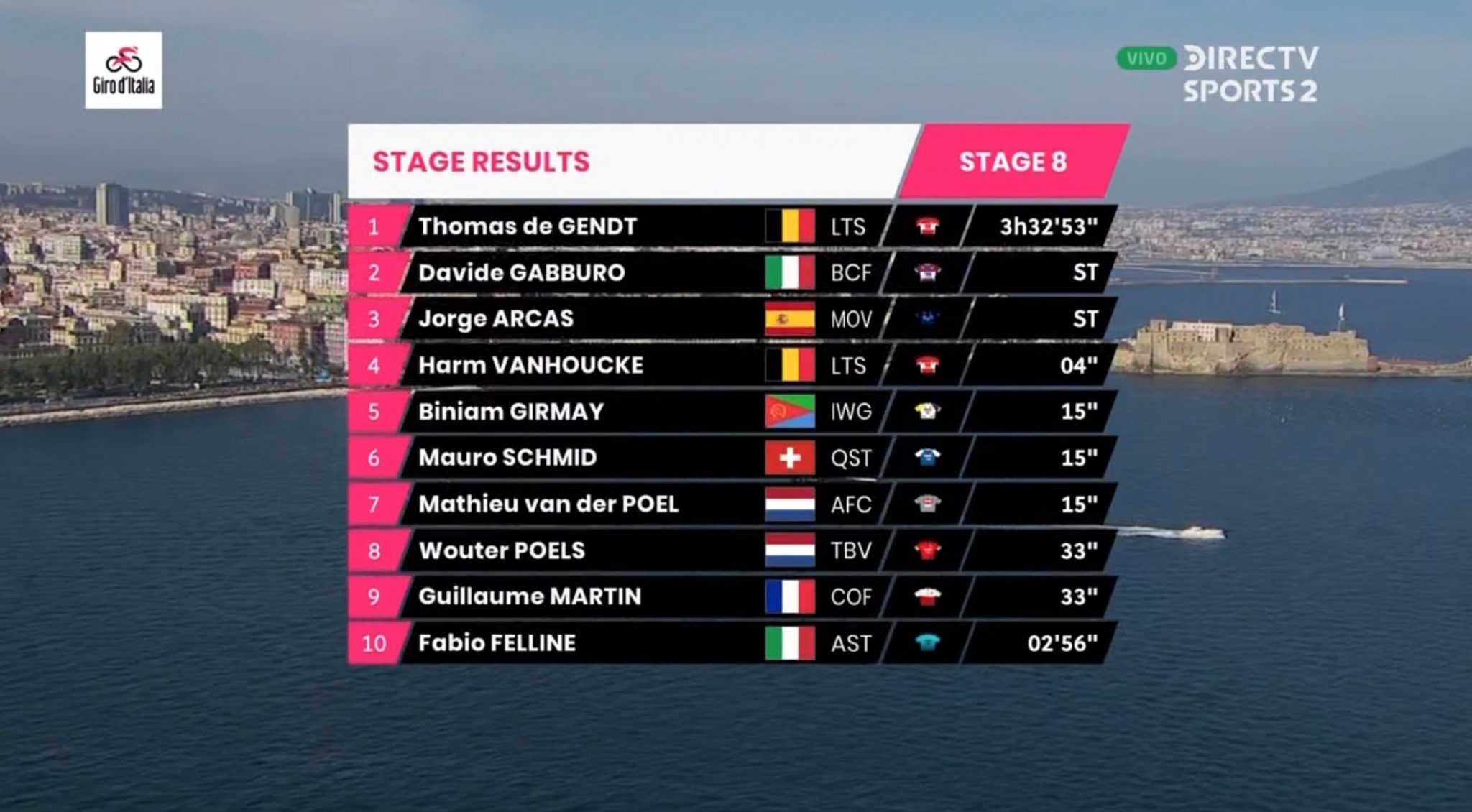 El ciclista belga Thomas De Gendt ganó la etapa 8 del Giro de Italia, en un recorrido de 153 km. con inicio y final en Nápoles.