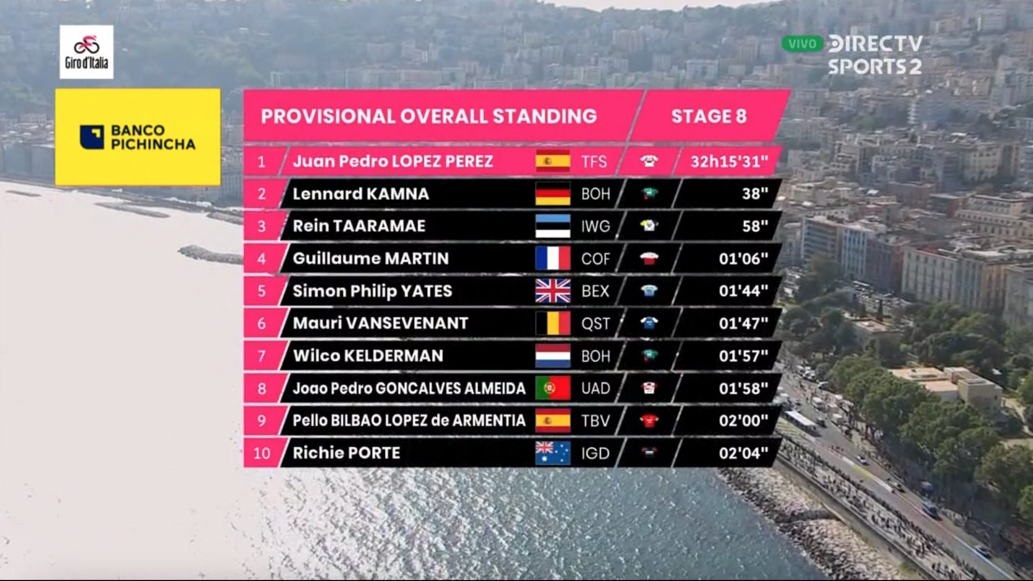 El español Juan Pedro López mantiene la Maglia Rossa por quinta etapa consecutiva, tras finalizar en la posición 49°, a 3:33 de la punta, sin embargo sigue firme en la punta con 38 segundos de diferencia con el segundo lugar. Por otra parte, Richard Carapaz quedó 38° en esta etapa y se mantiene como el mejor latinoamericano en la general con el puesto 12°, a 2 minutos y 6 segundos de la punta.
