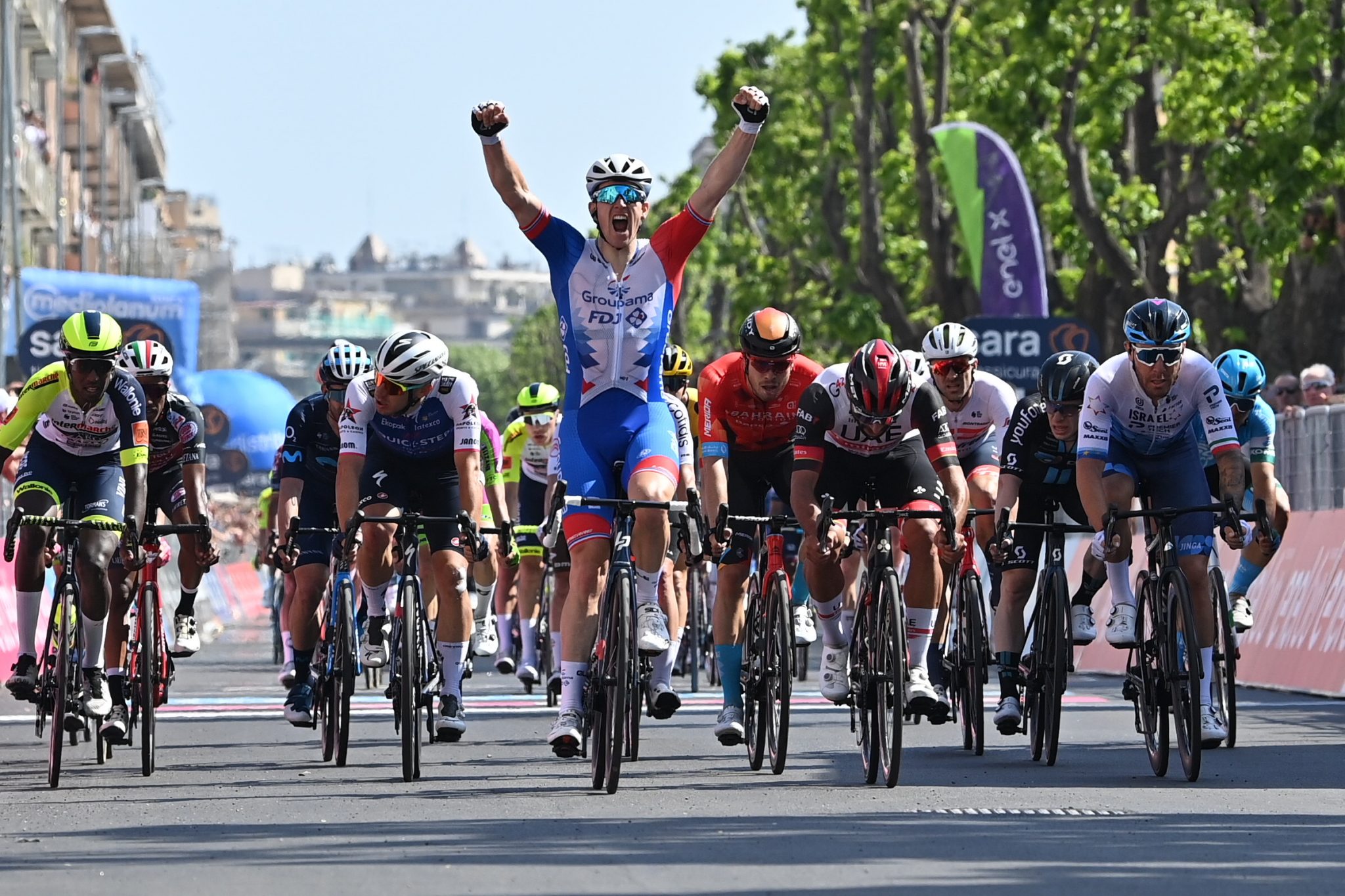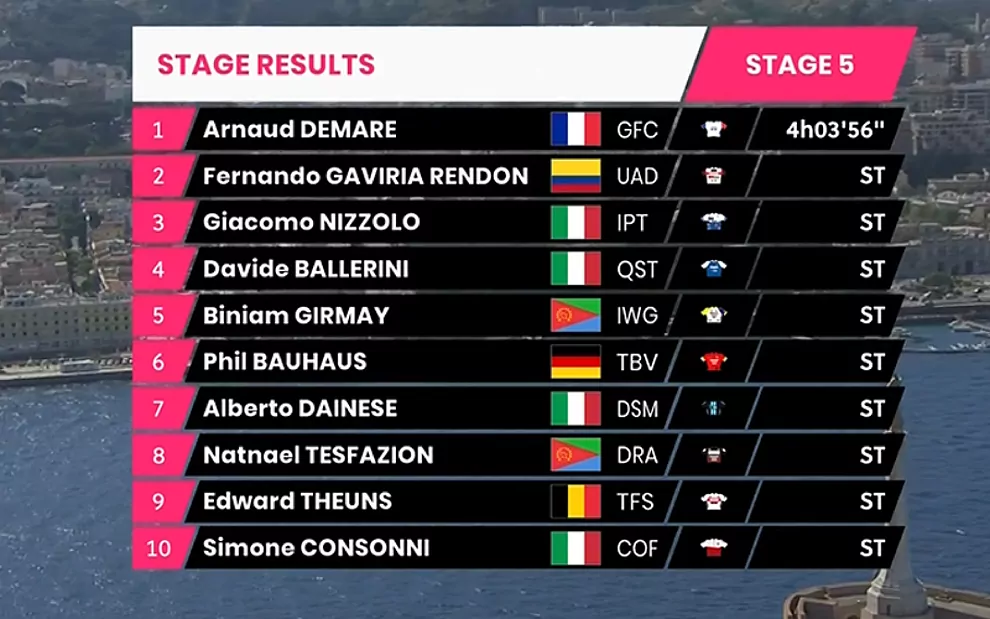 El ciclista francés Arnaud Demare ganó la etapa 5 del Giro de Italia, en un recorrido de 174 kilómetros entre Catania y Messina, una etapa principalmente llana, pero que contó con una subida de casi 30 kilómetros en la mitad del circuito, y con un final de infarto en que un grupo compacto de más de 25 ciclistas llegaron juntos a meta.