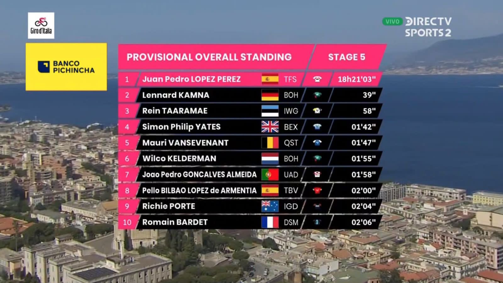 El español Juan Pedro López mantiene la Maglia Rossa, luego de llegar en la posición 58°, sin embargo con el mismo tiempo de los punteros de la etapa, lo que le permitió no bajar en la general. Por otra parte, Richard Carapaz se mantiene como el mejor latinoamericano en la general con el puesto 11°, a 2 minutos y 6 segundos de la punta.