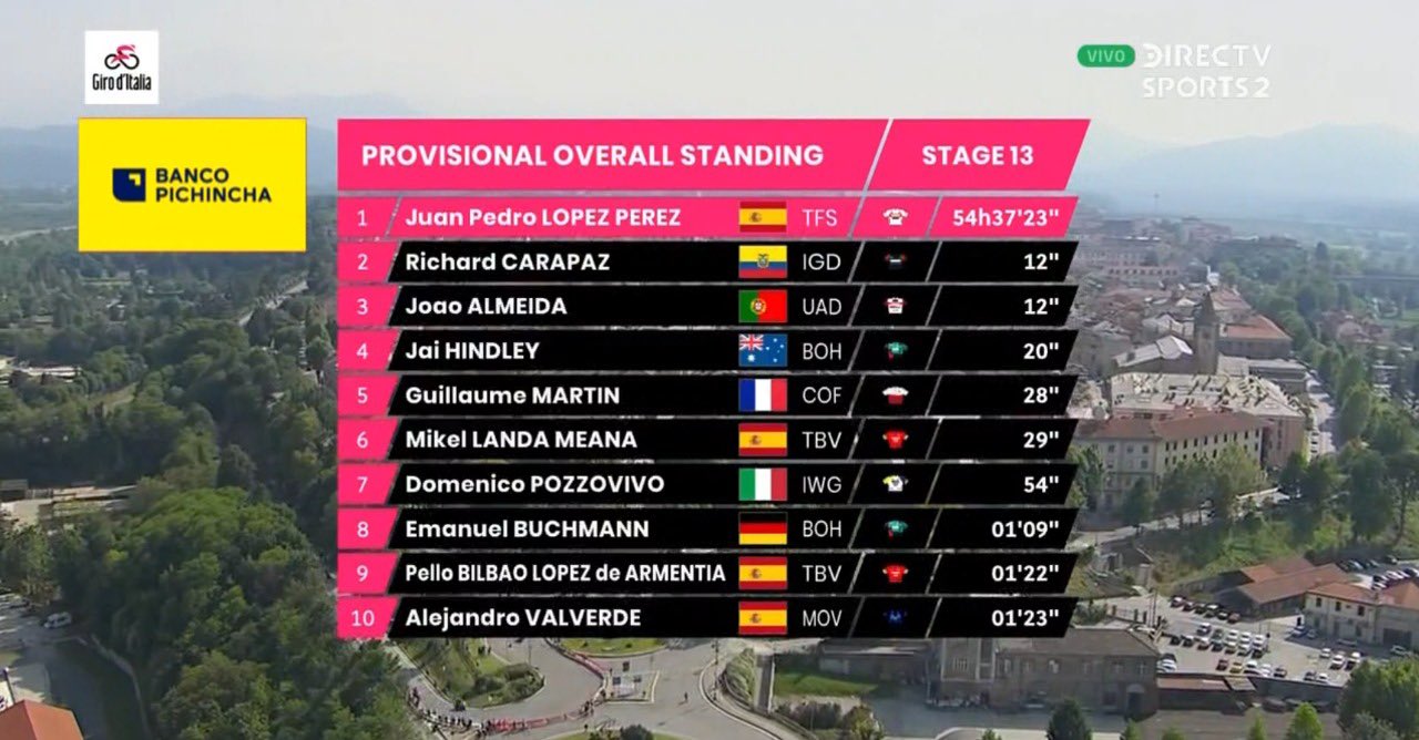 No hubo grandes cambios en la general, por lo que el español Juan Pedro López mantiene la Maglia Rossa con un tiempo total de 54 horas, 37 minutos y 23 segundos con una ventaja de solo 12 segundos con Richard Carapaz, quien se mantiene como escolta del español. siendo así el mejor latinoamericano en la general.
