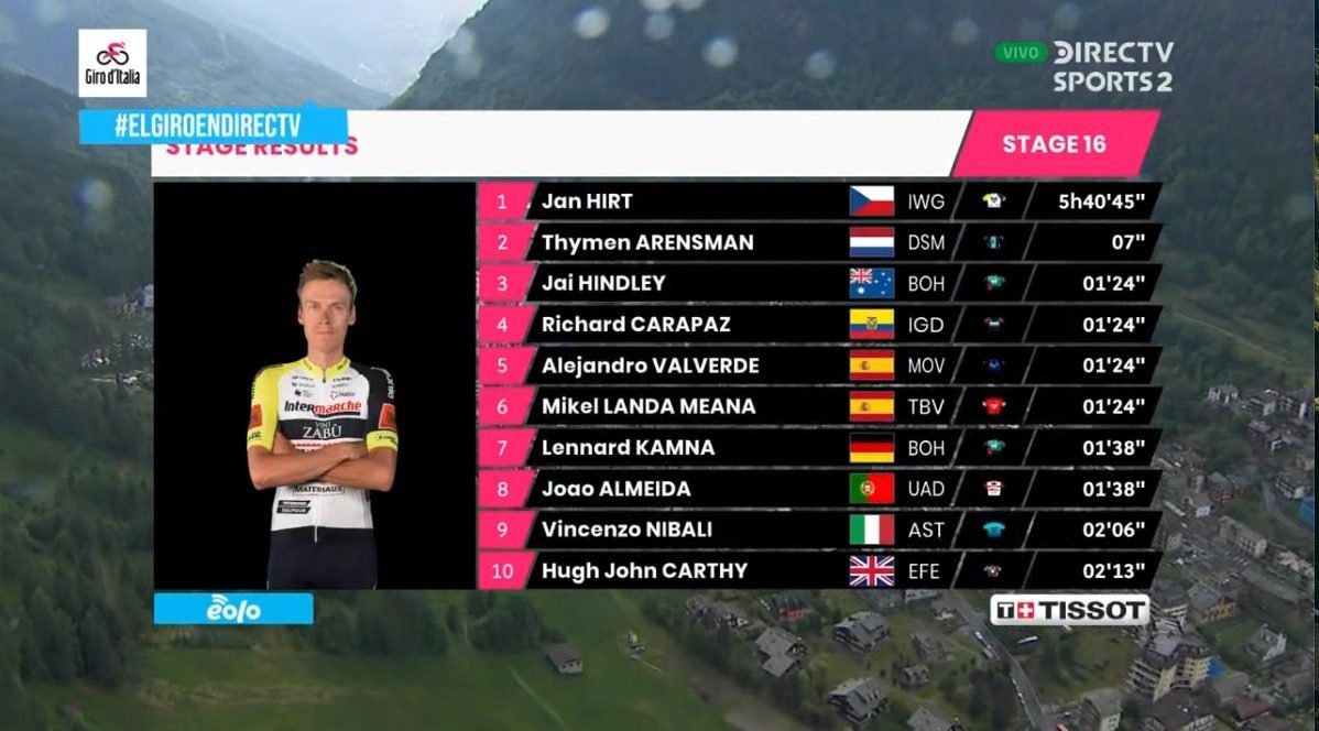El ciclista checo Jan Hirt (Intermarché-Wanty-Gobert Matériaux) ganó la etapa 16 del Giro d’Italia, en un recorrido de 202 km entre Saló y Aprica con más de 5.000 metros de desnivel, con una fuga en solitario que le permitió conseguir su primera victoria en el World Tour.