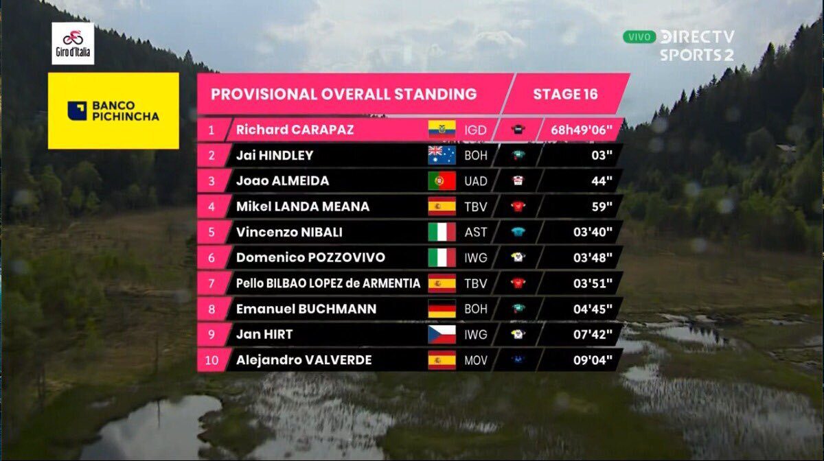 La general, se mantiene liderada por Richard Carapaz (Ineos Grenadiers) con un tiempo total de 68 horas, 49 minutos y 6 segundos con una ventaja de solo 3 segundos con Jai Hindley , quien se mantiene como escolta del ecuatoriano.