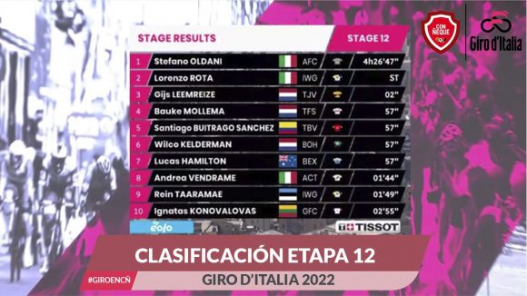 El italiano Stefano Oldani ganó la 12ª etapa del Giro de Italia, la más larga de esta edición con 204 kilómetros entre Parma y Génova, e inscribió la segunda victoria italiana consecutiva, luego del triunfo de Alberto Dainese.