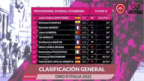 Juan Pedro López no estuvo en el podio de esta etapa, pero sigue firme en el primer lugar de la clasificación general de Maglia Rossa. Sin embargo, el español no puede relajarse, ya que lo sigue Richard Carapaz, el mejor latinoamericano de la competencia, que se ubica a 12 segundos.