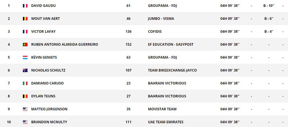 El ciclista de Groupama – FDJ realizó un tiempo de 4 horas con 9 minutos y 38 segundos, venciendo a van Aert (Jumbo Visma y Victor Lafay (Cofidis), quienes obtuvieron el segundo y tercer lugar respectivamente.