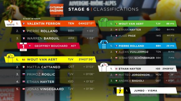 El francés Valentin Ferron tuvo un gran esprint que le permitió ganar la 6ª etapa del Critérium du Dauphiné, disputada entre Rives y Gap, con un recorrido de 196 kilómetros, mientras que el belga Wout van Aert mantiene el liderato individual.