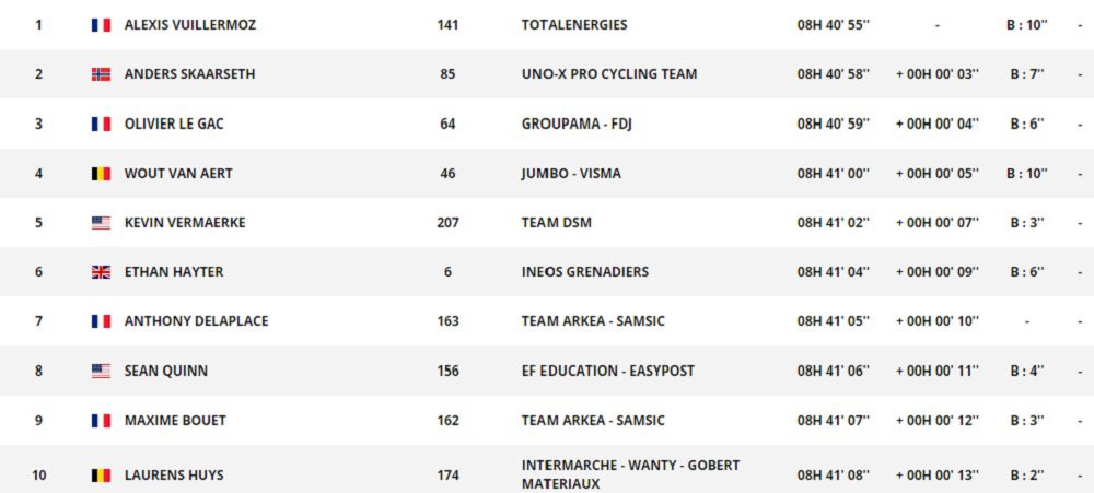 - Líder (mejor general): Alexis Vuillermoz (Team Total Energies) 8 horas, 40 minutos y 55 segundos