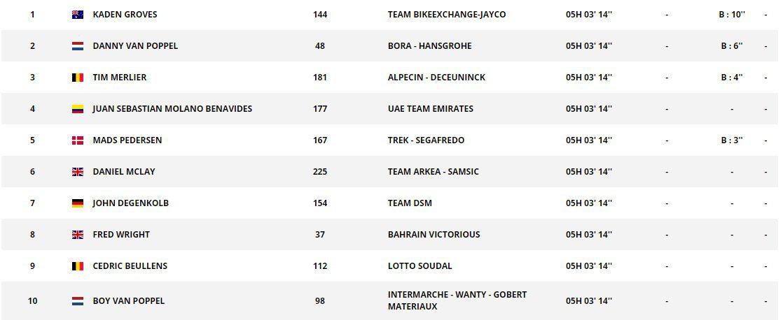 Groves cruzó la meta con un tiempo de 5 horas, 3 minutos y 14 segundos, con una leve ventaja al holandés Danny Van Poppel (Bora-Hansgrohe), quien llegó en el segundo puesto, mientras que el belga Tim Merlier (Alpecin-Deceuninck) terminó en el tercer lugar.