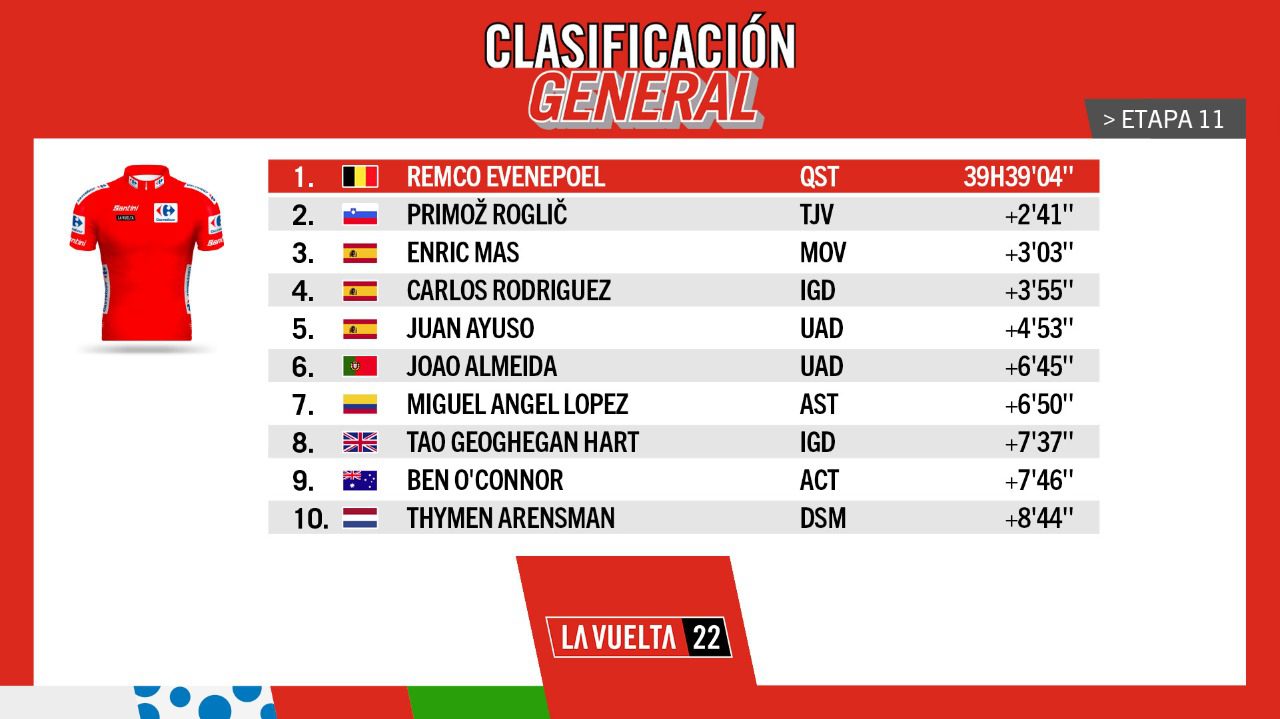 - Maillot Rojo (mejor general): Remco Evenepoel (Quick-Step Alpha Vinyl Team) 39 horas con 39 minutos y 4 segundos