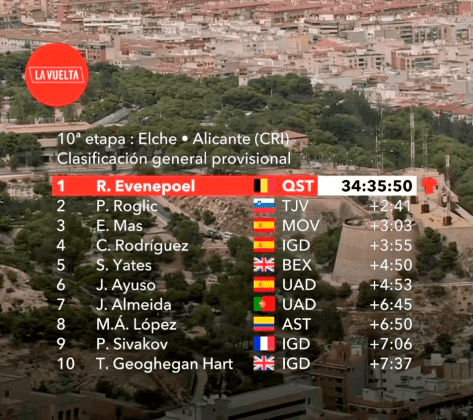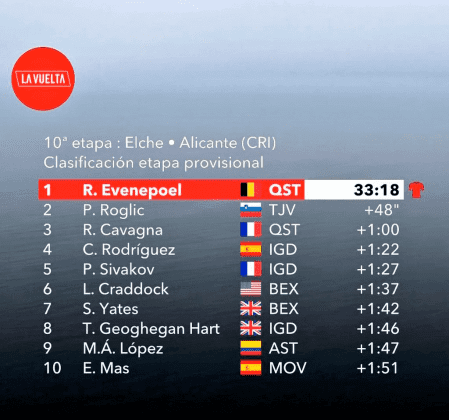 El ciclista belga Remco Evenepoel (Quick-Step Alpha Vinyl Team) ganó la 10ª etapa de La Vuelta en un recorrido de contrarreloj de 30,9 kilómetros entre Elche y Alicante, de este modo, acrecienta su ventaja en la general.
