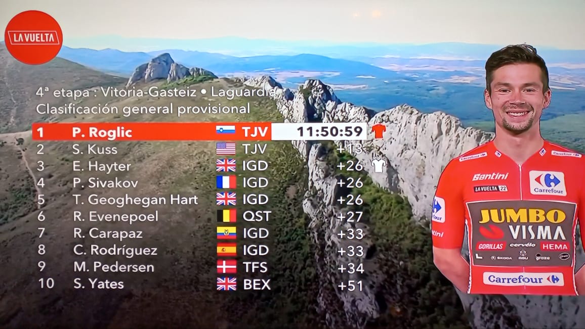 El ciclista esloveno Primož Roglič (Jumbo-Visma), ganó la etapa 4ª de La Vuelta a España en un recorrido de 152,5 kilómetros entre Vitoria-Gasteiz y Laguardia, una etapa de media montaña que tuvo el calor como factor clave, con una temperatura cercana a los 33°. Con esta victoria el tricampeón del evento español suma 10 etapas ganadas en La Vuelta.