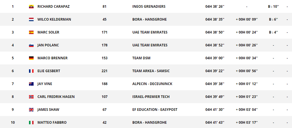 Carapaz cruzó la meta con un tiempo de 4 horas, 38 minutos y 26 segundos, sacándole una ventaja de 9 segundos al neerlandés, Wilco Kelderman (Bora-Hansgrohe) quien finalizó en el segundo lugar. El español Marc Soler (UAE Team Emirates) cerró el podio con el tercer lugar, registrando un tiempo de 4:38:50.