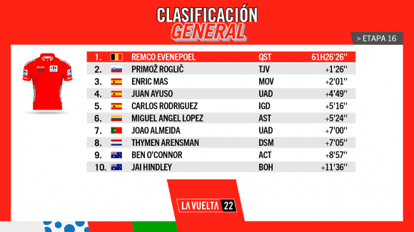 La clasificación general sigue liderada por Remco Evenepoel (Quick-Step Alpha Vinyl Team), pese a que sufrió un pinchazo a 2,4 kilómetros de la meta, acumulando un tiempo de 61 horas, 26 minutos y 26 segundos, seguido del esloveno Primož Roglič (Jumbo-Visma), quien sigue en la segunda posición de la general a 1 minutos y 26 segundos del belga.