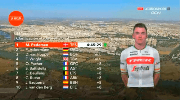 El ciclista danés Mads Pedersen (Trek-Segafredo) ganó la etapa 16ª de La Vuelta a España en un recorrido de 189,4 kilómetros entre Sanlúcar de Barrameda y Tomares, una etapa que tuvo la caída de Primoz Roglic en los últimos metros y mantiene a Remo Evenepoel como líder general.