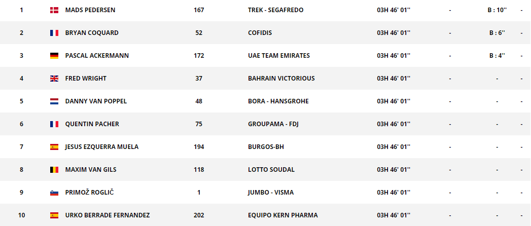 - Maillot Verde (mejor sprínter): Mads Pedersen (Trek-Segafredo) 184 puntos