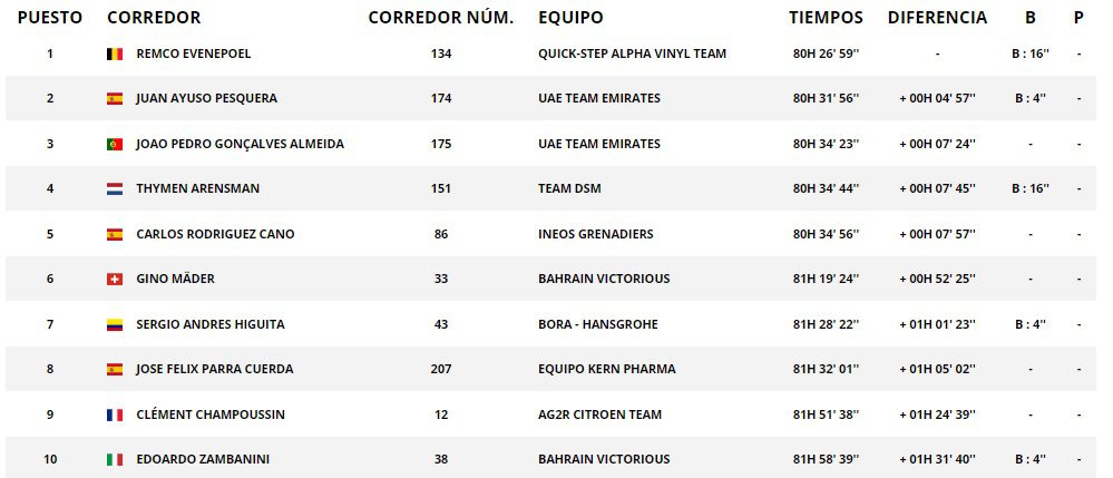 - Maillot rojo (mejor general): Remco Evenepoel (Quick-Step Alpha Vinyl Team) 80 horas, 26 minutos y 59 segundos