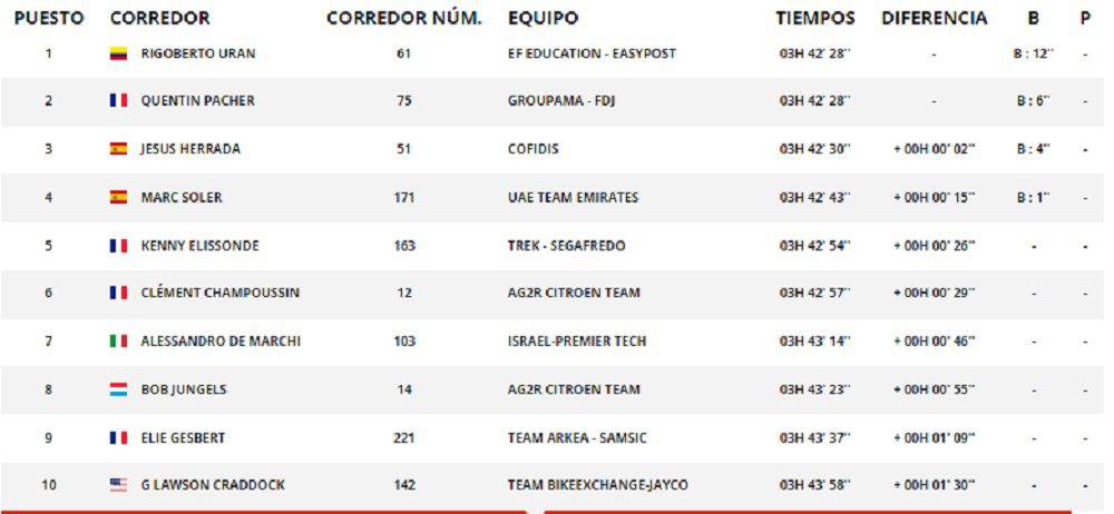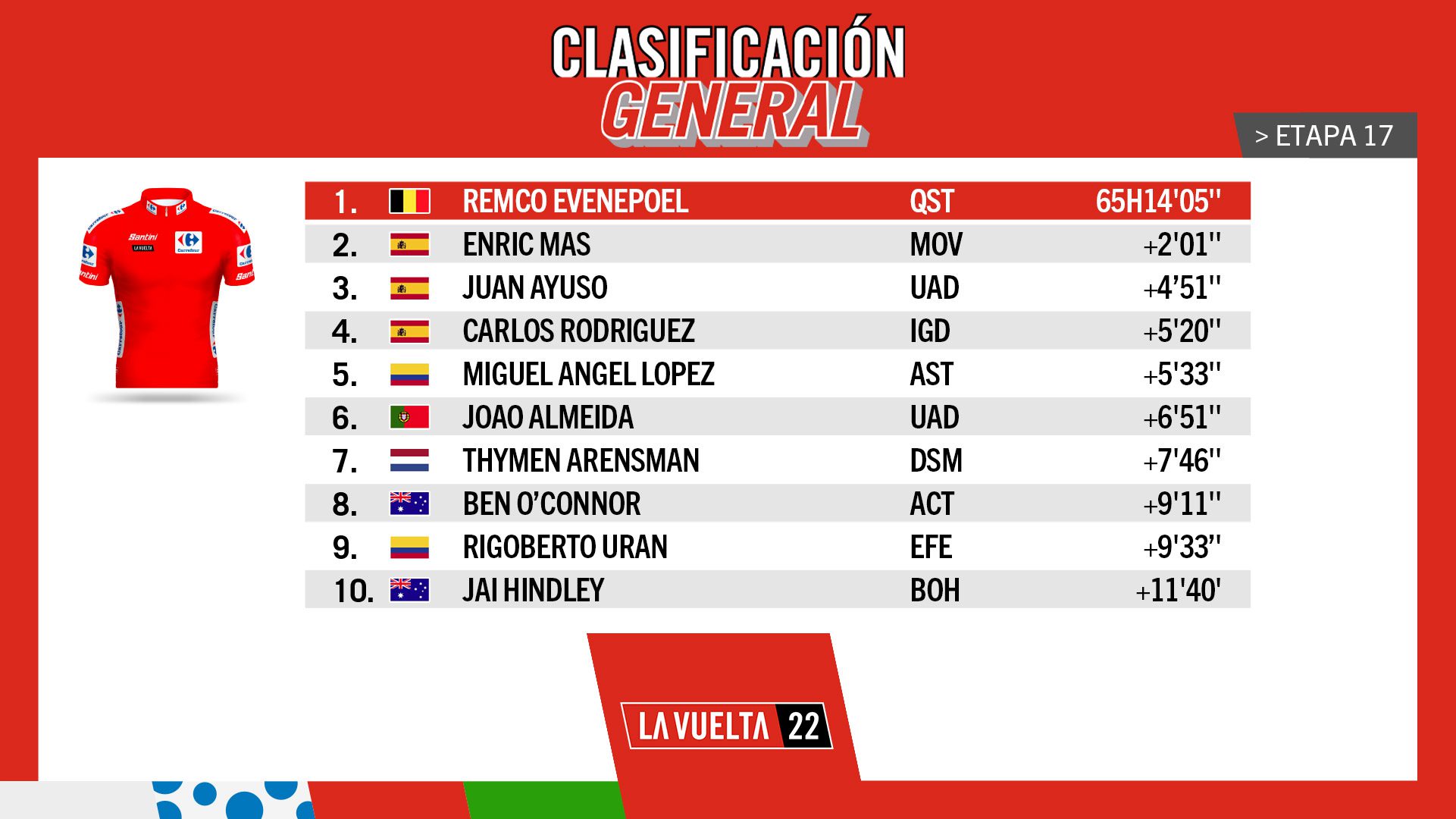 Pese a quedar fuera del top10 de la etapa, la clasificación general sigue liderada por el belga Remco Evenepoel (Quick-Step Alpha Vinyl Team), con poco más de 2 minutos de diferencia sobre el segundo, el español Enric Mas (Movistar Team), tras el abandono del vigente tricampeón Primoz Roglic (Jumbo-Visma).
