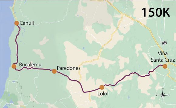 La distancia de 150K contempla su partida y meta en la Viña Santa Cruz, pasando por las localidades de Lolol, Paredones, Bacalemu y Cahuil.