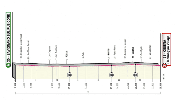El domingo 14 de mayo se realizará la 9ª etapa, Savignano Sul Rubicone – Cesena, que contempla una prueba de contrarreloj de 35 kilómetros.