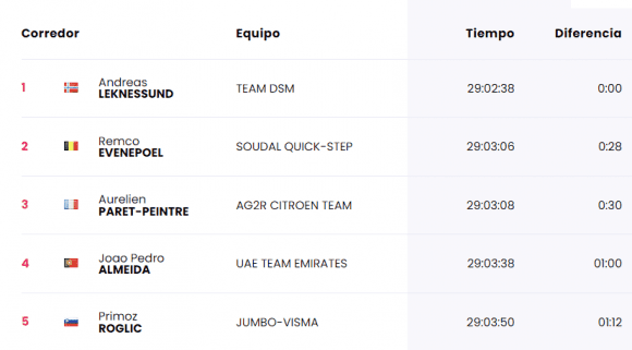 - Maglia Rossa (mejor de la general): Andreas Leknessund (Team DSM) 29:02:38