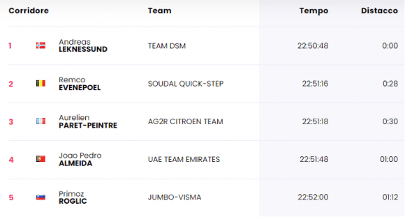 - Maglia Rossa (mejor de la general): Andreas Leknessund (Team DSM) 22:50:48