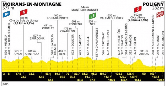La etapa 18ª del Tour de Francia continúa mañana con un recorrido de 173 kilómetros entre Moirans-en-Montagne y Poligny, una carrera nuevamente de sprint en estado puro que tiene una recta final de 8 kilómetros, ideal para el mejor esprínter del Tour, Jasper Philipsen (Alpecin-Deceuninck).