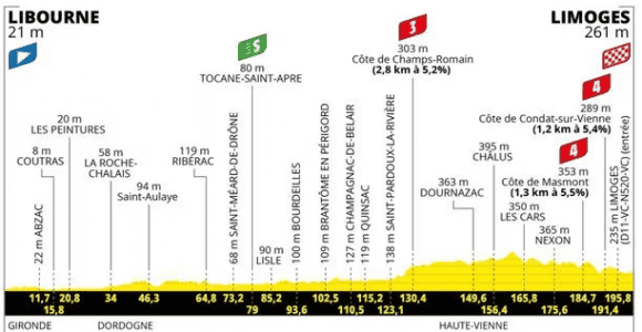 La 8ª etapa del Tour de Francia continúa mañana con un recorrido de 201 kilómetros entre Libourne y Limoges, una etapa que favorecerá a los velocistas más explosivos de la carrera.