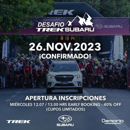 El próximo domingo 26 de noviembre se realizará el Desafío Trek Subaru 2023, evento que mantendrá sus cuatro distancias tradicionales (45K, 33K, 25K y 16k), con la gran novedad del debut de las bicicletas E-Bike, y las inscripciones abren hoy a las 13:00 horas con cupos limitados al 40% de descuento.