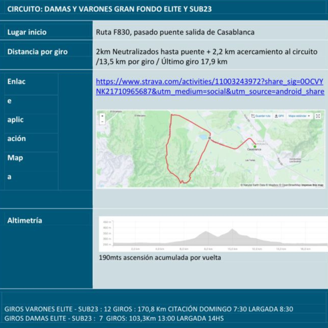 - Elite y Sub-23 varones 170.8 km – 12 giros.