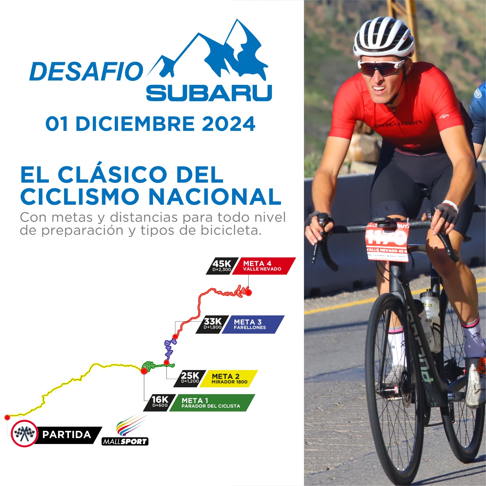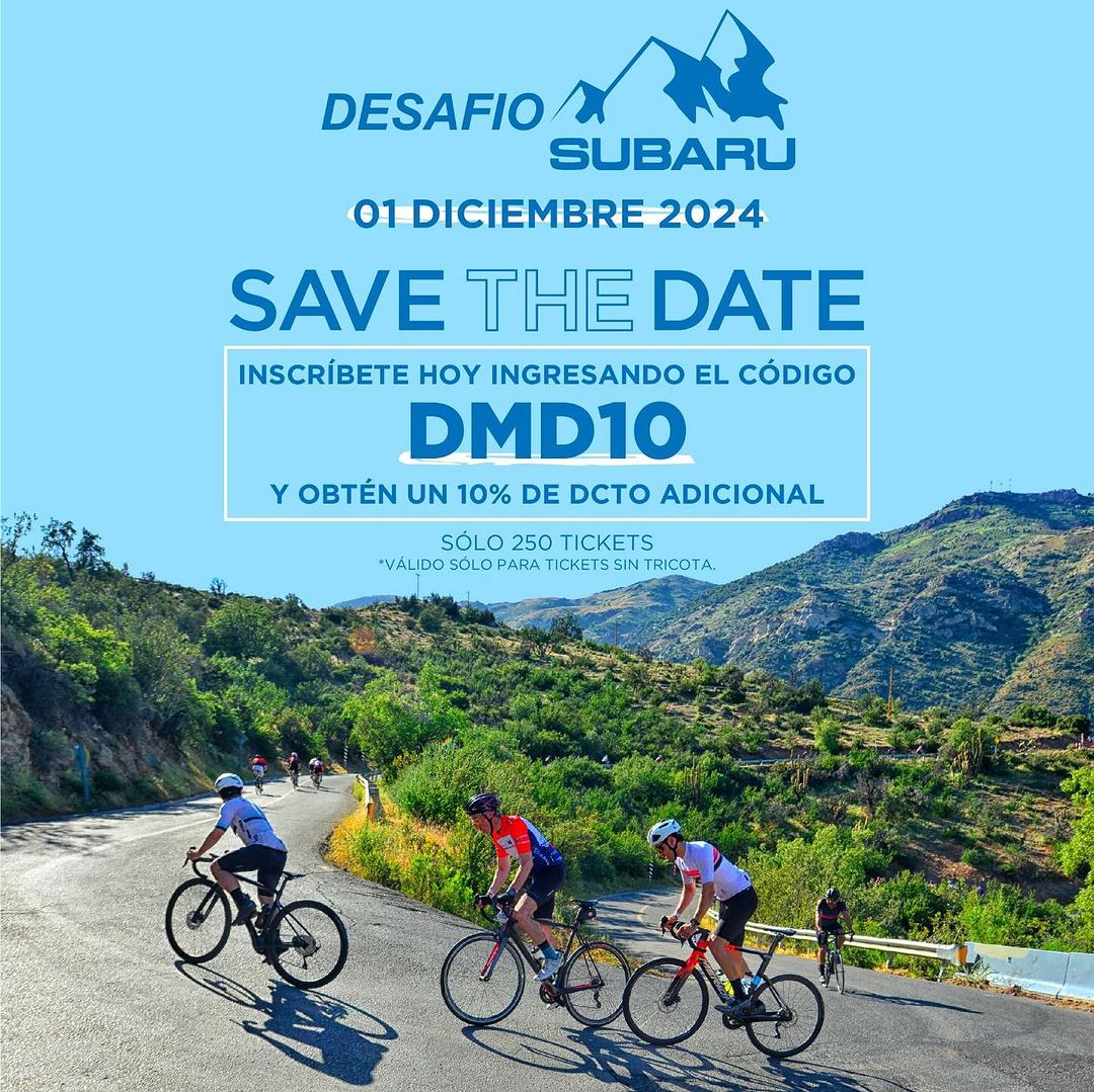 Uno de los grandes eventos de ciclismo que tiene lugar en Santiago es el Desafío Subaru, competencia con un punto de partida y 4 distintas metas en la Cordillera de Los Andes y que anunció un cambio en su fecha de realización: Ahora se celebrará el domingo 1 de diciembre de 2024.