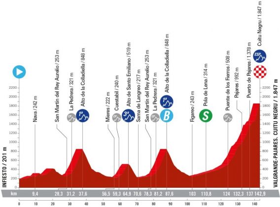 Posteriormente, la etapa 15 trasladará los ciclistas por un tramo de 143 km de montaña desde Infiesto hasta Valgrande-Pajares.