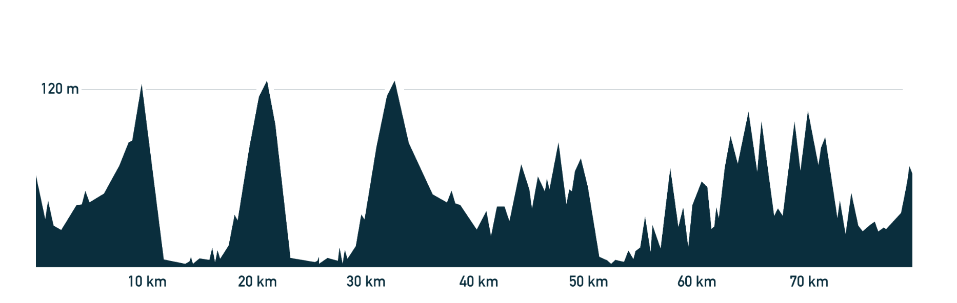 El recorrido de 80 km ofrece un trazado dinámico con repechos iniciales pero mucho menos exigente que el Gran Fondo.