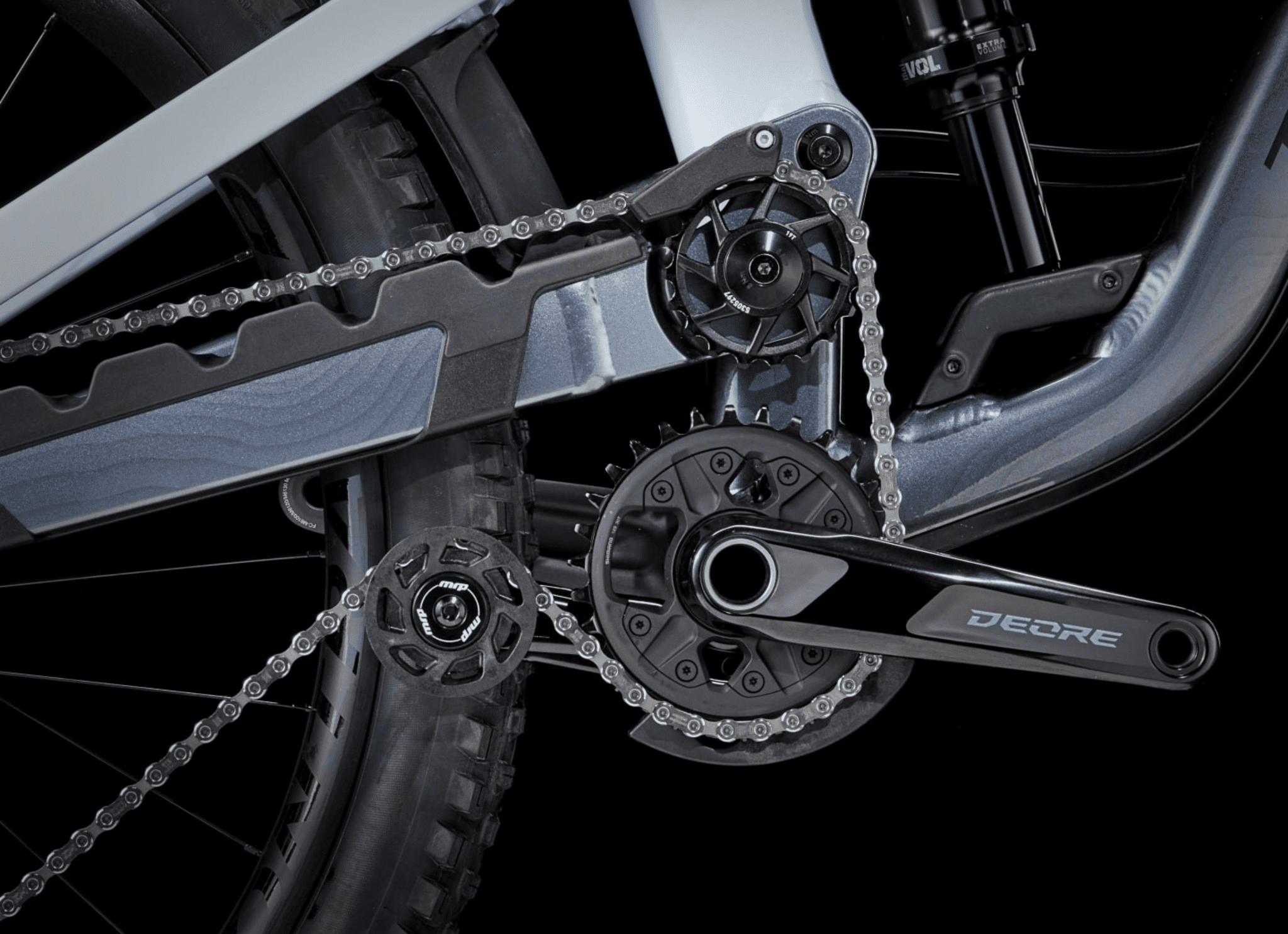 Otro de los aspectos llamativos de esta nueva Trek, es sin duda la “polea loca superior” que minimiza el retroceso del pedal, optimizando la eficiencia en cada pedaleo. La polea inferior reduce la tensión de la cadena para cambios más suaves y una mejor respuesta de la suspensión en descensos técnicos.