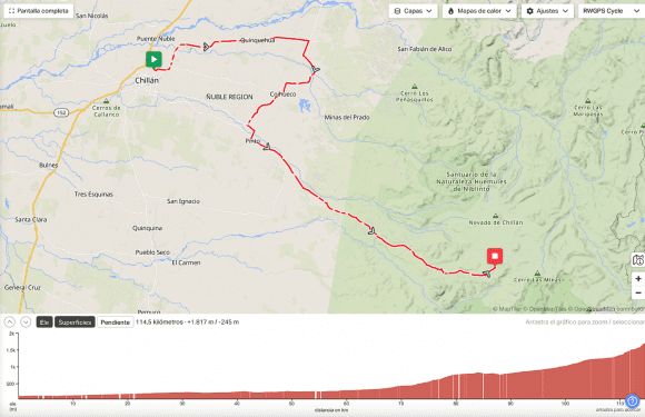 Desafío Gran Fondo: Cuenta con 120 kilómetros de distancia y un desnivel de 1800 metros acumulado, el recorrido será desde el Centro Deportivo Quilamapu, cruzando las localidades de Pinto y Coihueco, culminando en el Hotel Nevados de Chillán.