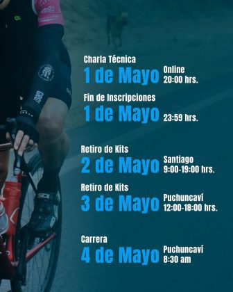 El retiro de kits se realizará el viernes 2 de mayo en Santiago, de 9:00 a 19:00 hrs en Tienda All4Bikers (Av. Las Condes 11.700, Santiago), y el sábado 3 de mayo, de 12:00 a 18:00 hrs en la Plaza de Puchuncaví.