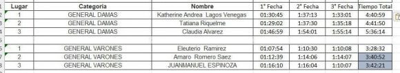 En las damas, el primer lugar a nivel general fue para Katherine Lagos, con un tiempo de 4 horas, 40 minutos y 59 segundos, seguida por Tatiana Riquelme (4:41:50) y completando el podio, Claudia Álvarez (5:36:14).