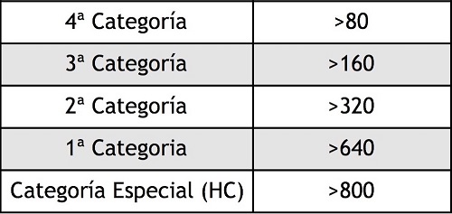 El método más sencillo es multiplicar la longitud en metros de la subida por el % de pendiente promedio, calculada esta última como la división entre la altura ganada y la distancia horizontal. La categoría del puerto se obtiene de buscar el número resultante en la siguiente tabla: