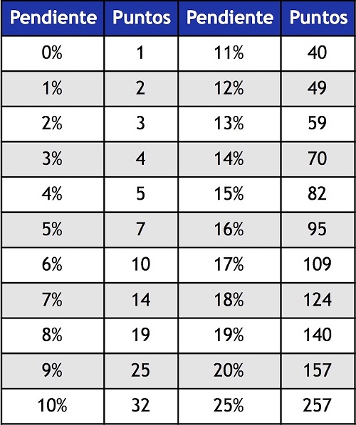Un sistema que refleja mejor la dureza de un ascenso es uno que no considera la longitud en el cálculo, sino solo la altura y la pendiente máxima, según la siguiente fórmula: